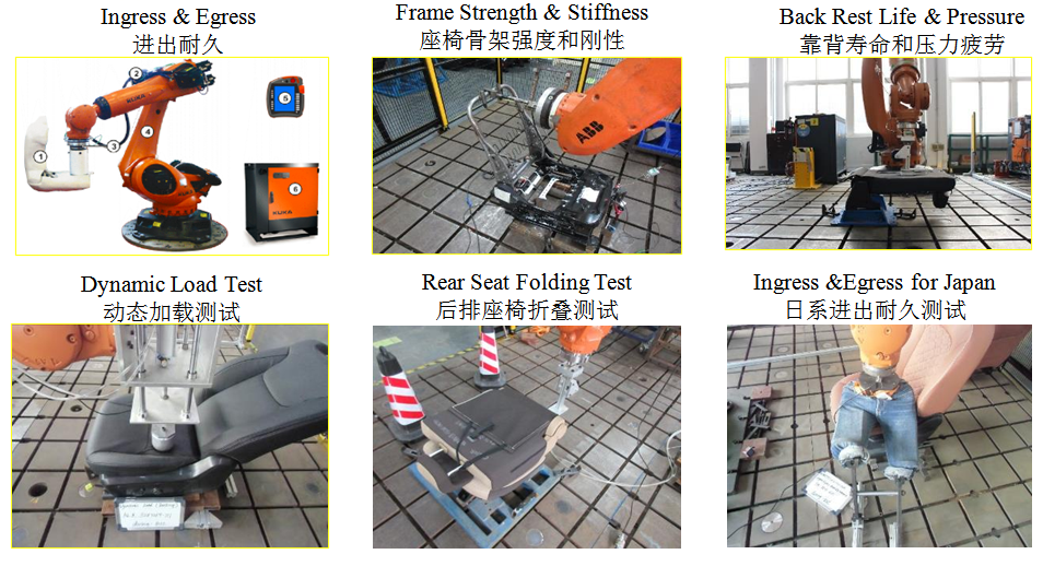 尺寸和三坐标尺寸测量、刚性和强度、操作耐久、高温点灯、配光、振动耐久、电动操作耐久、电流监控、防水、防尘、冲击、密封性、耐腐蚀、振动噪音、模态及固有频率、颠簸蠕动、进出耐久